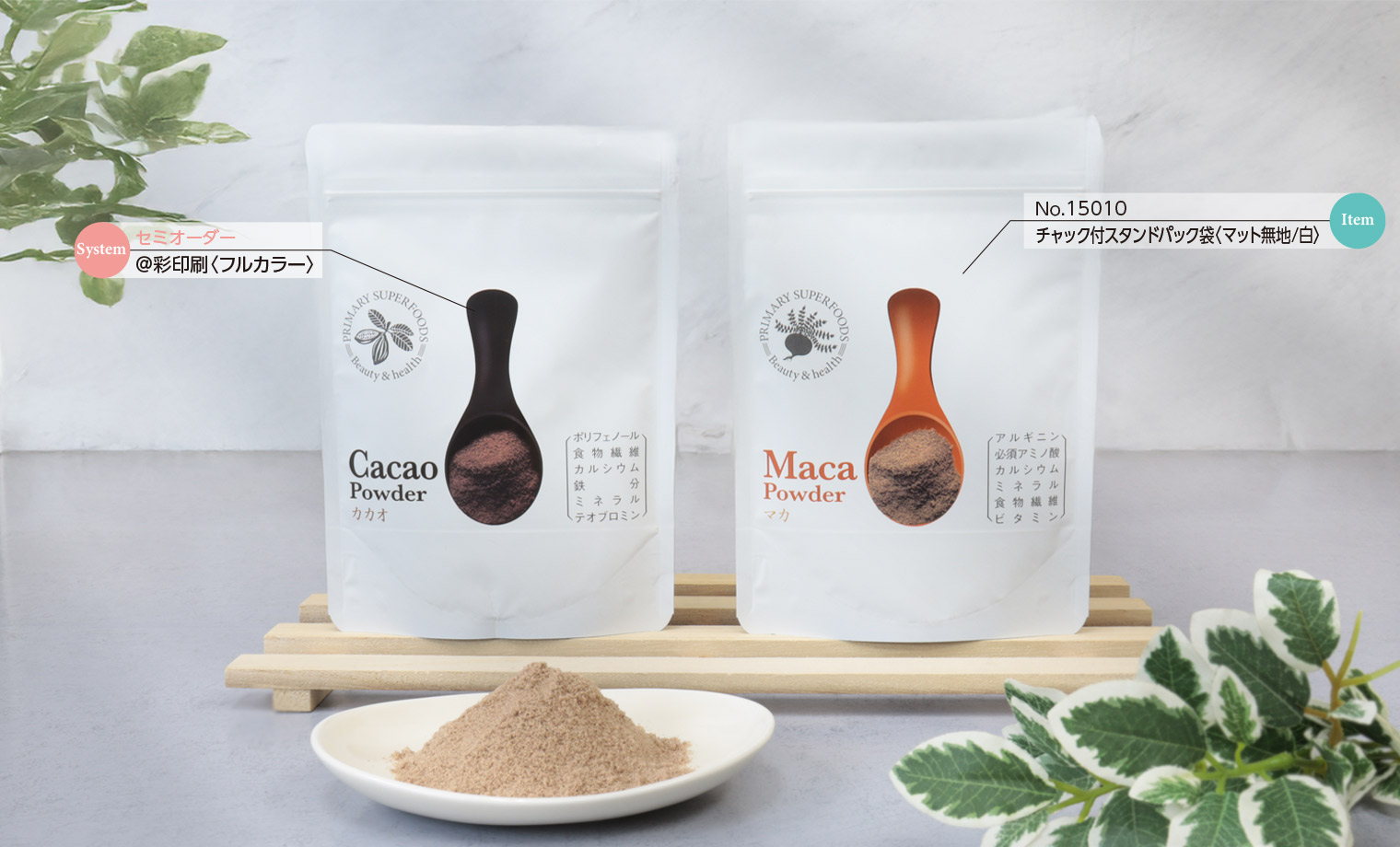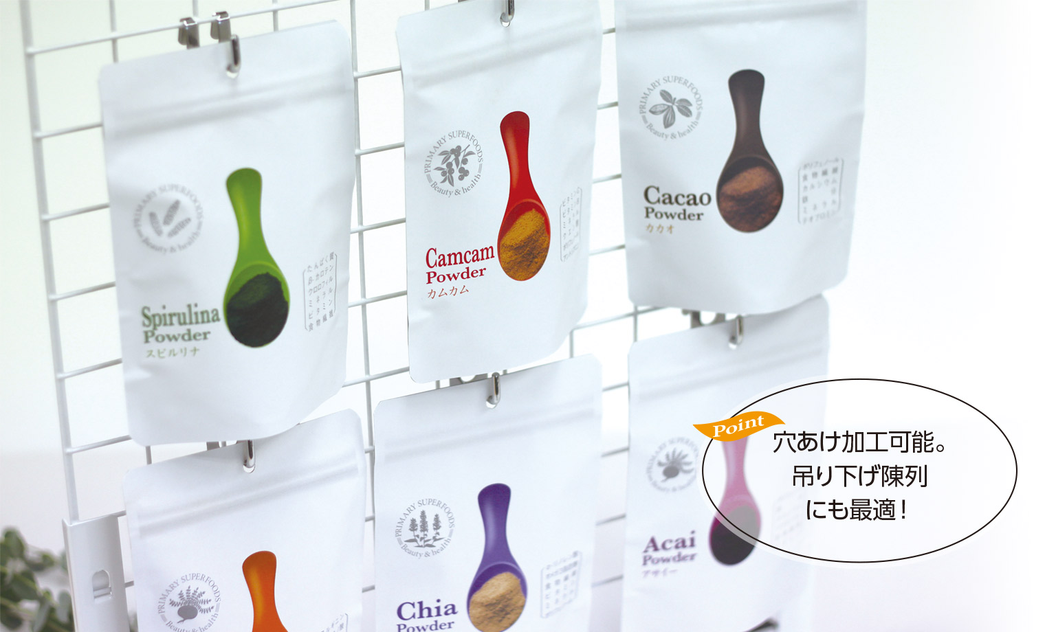 サプリメントから粉末タイプの健康食品まで、幅広くお使いいただける袋です。