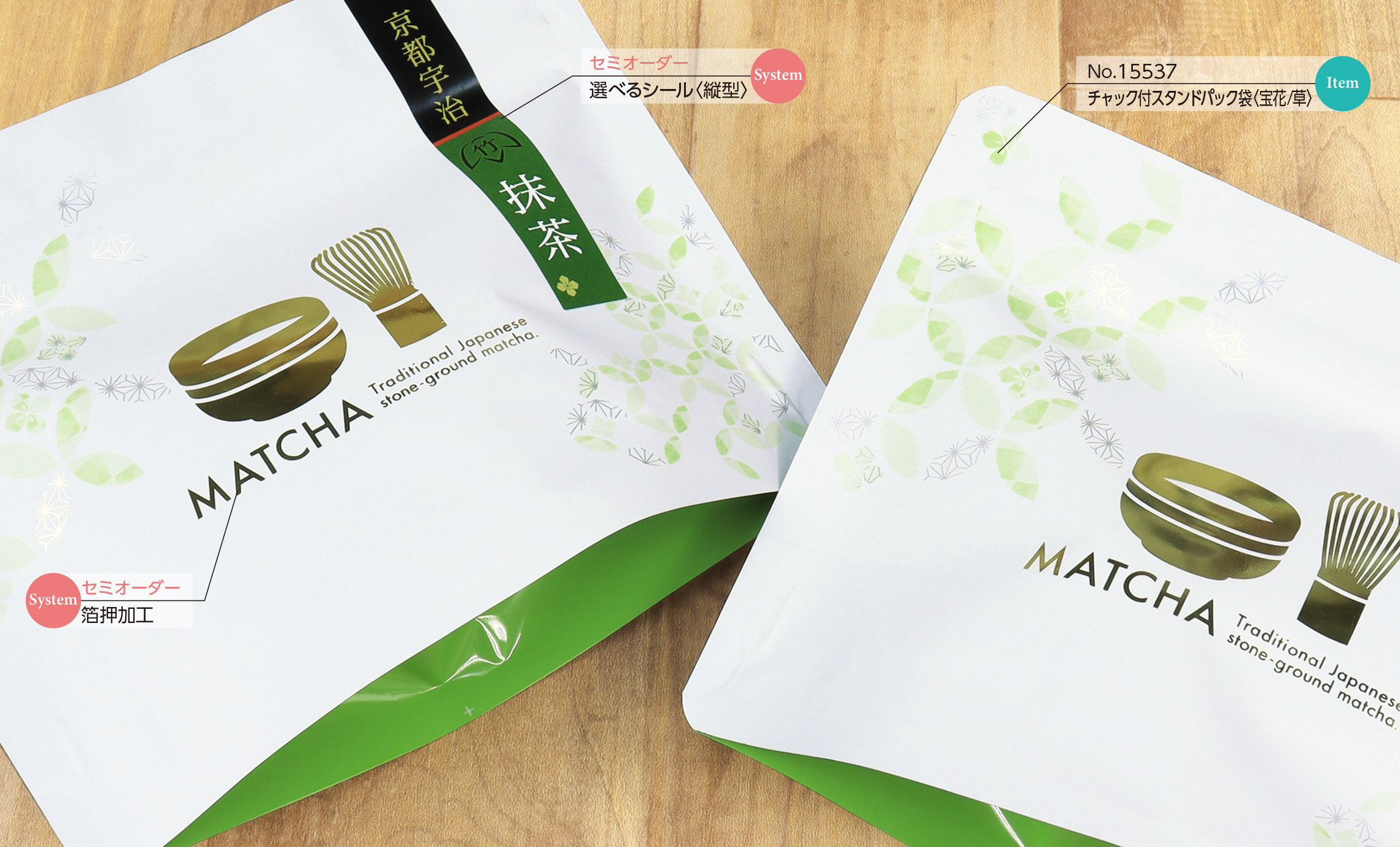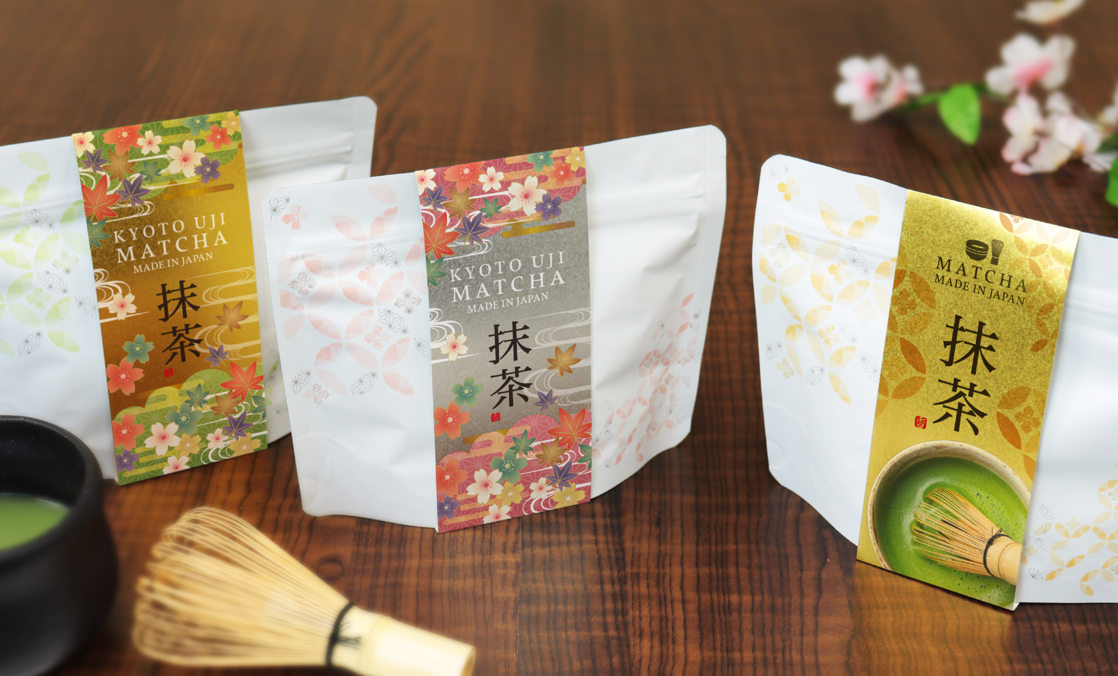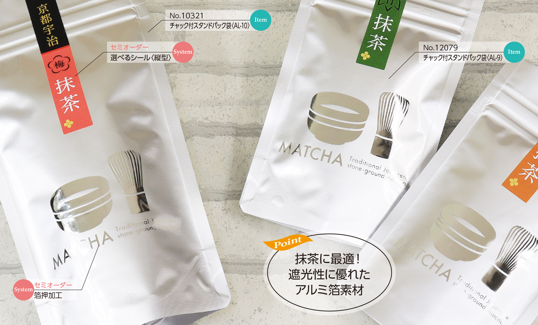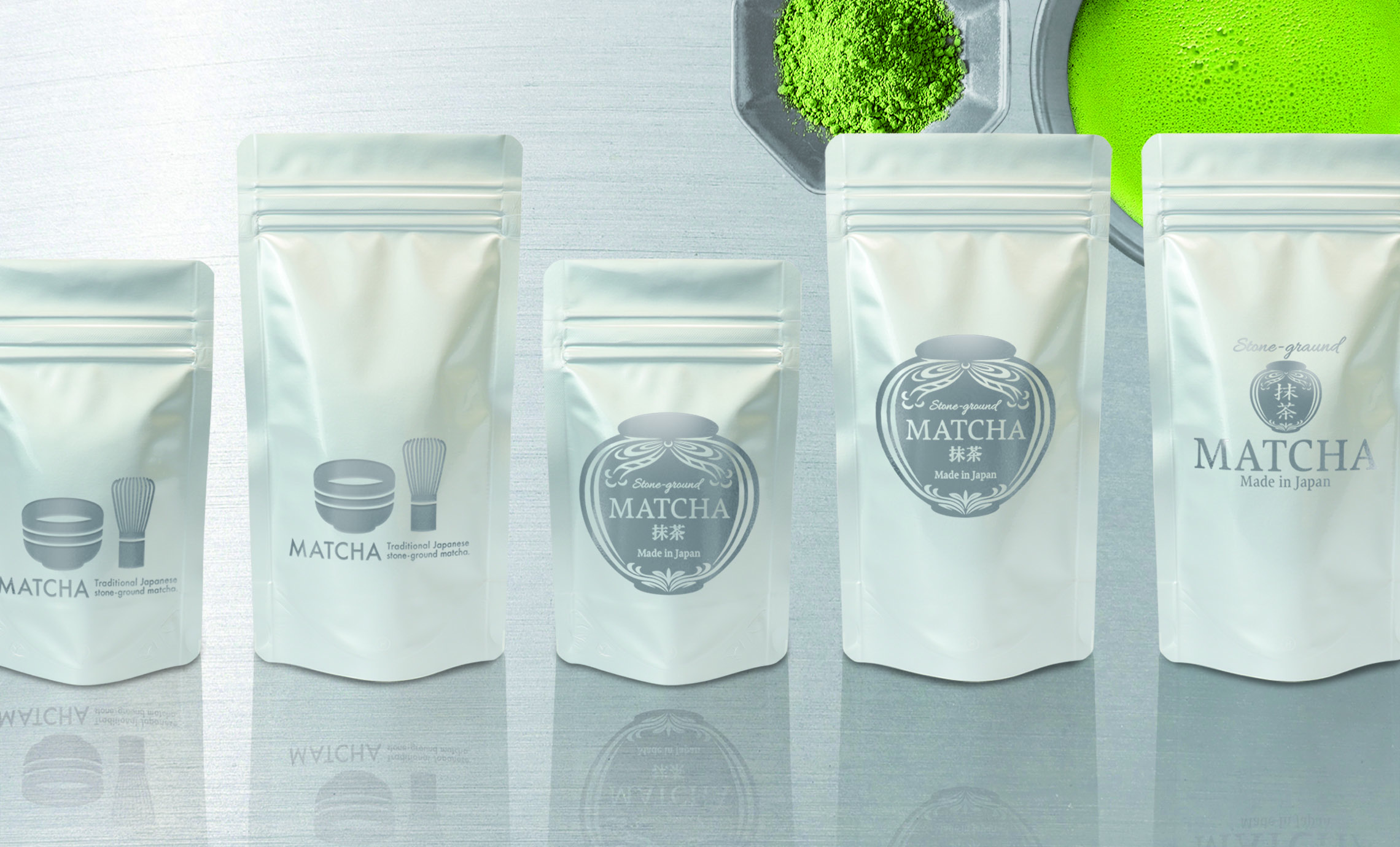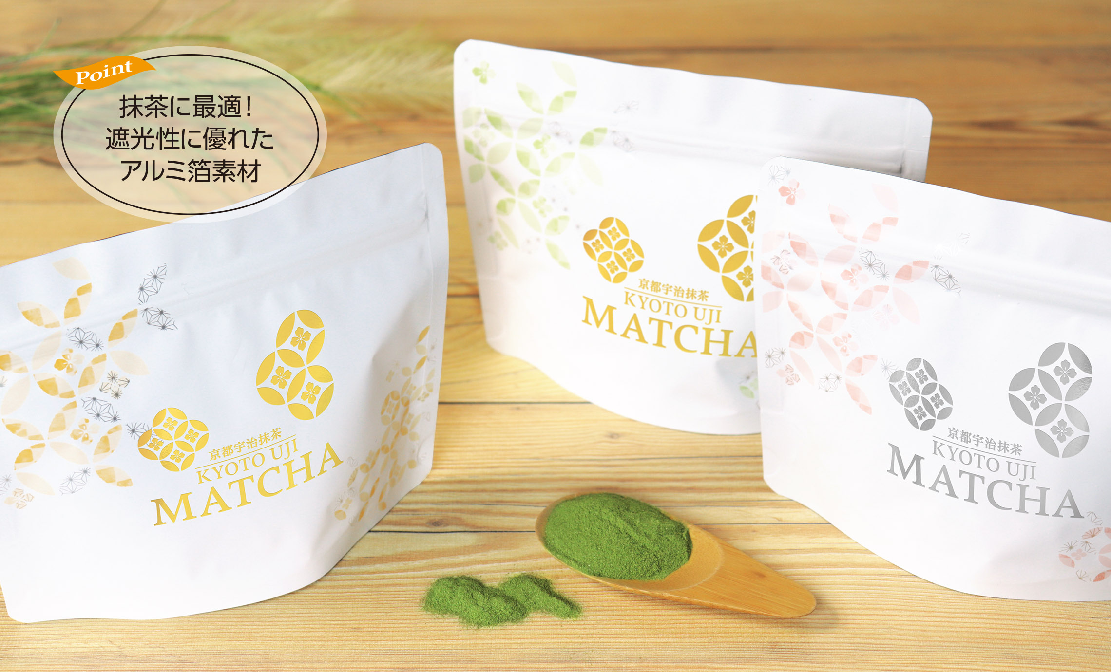 変質や変色に弱い抹茶を守る、アルミ箔素材のチャック付スタンドパック袋のご紹介です。