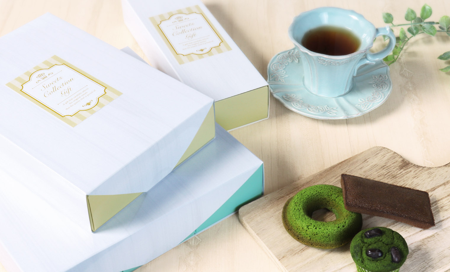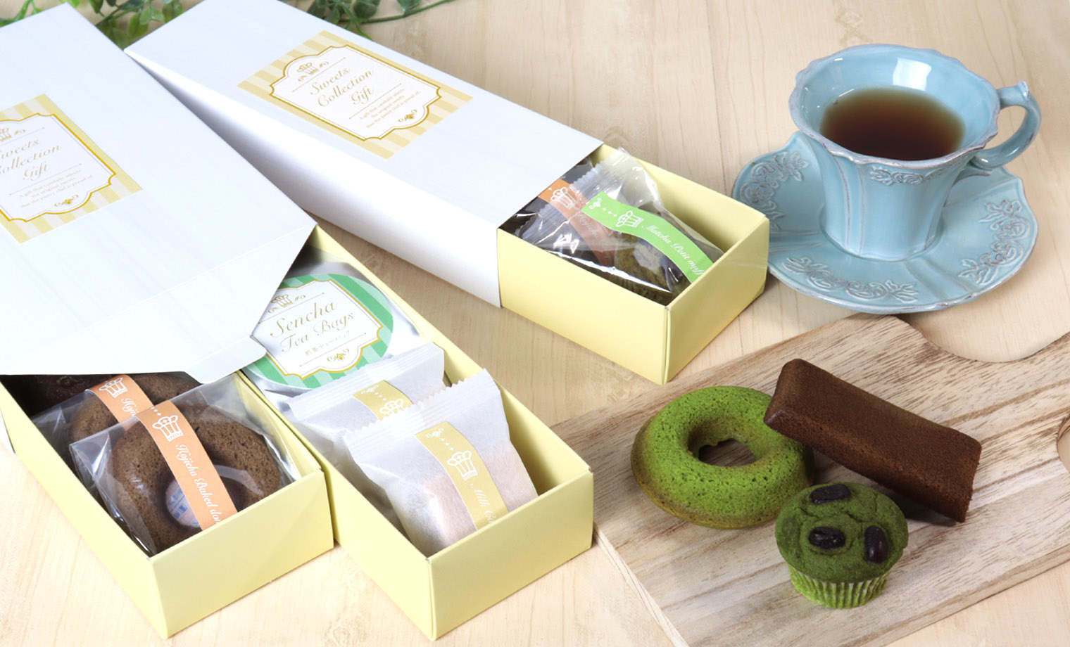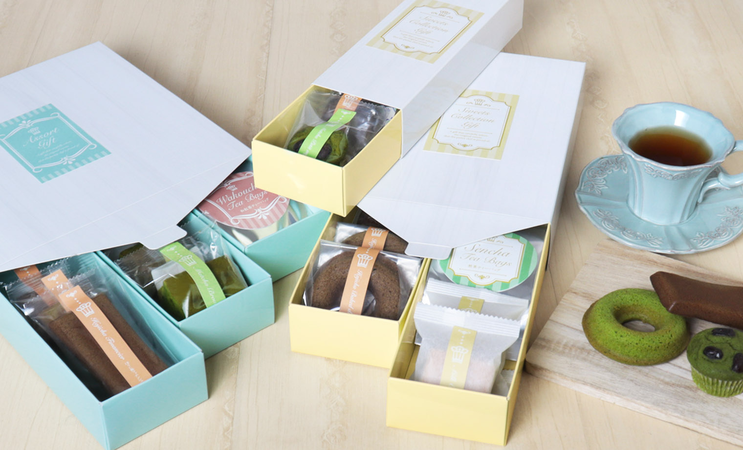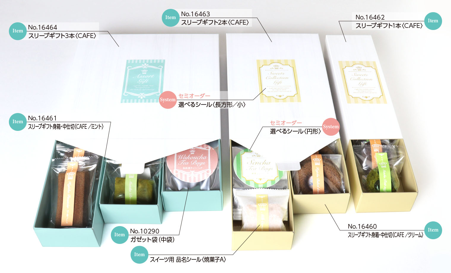 当社オリジナル焼菓子用のギフトケース「CAFE(カフェ)」。スイーツやティーバッグなどお好きなアソートギフトが小ロットでお作りいただけます。