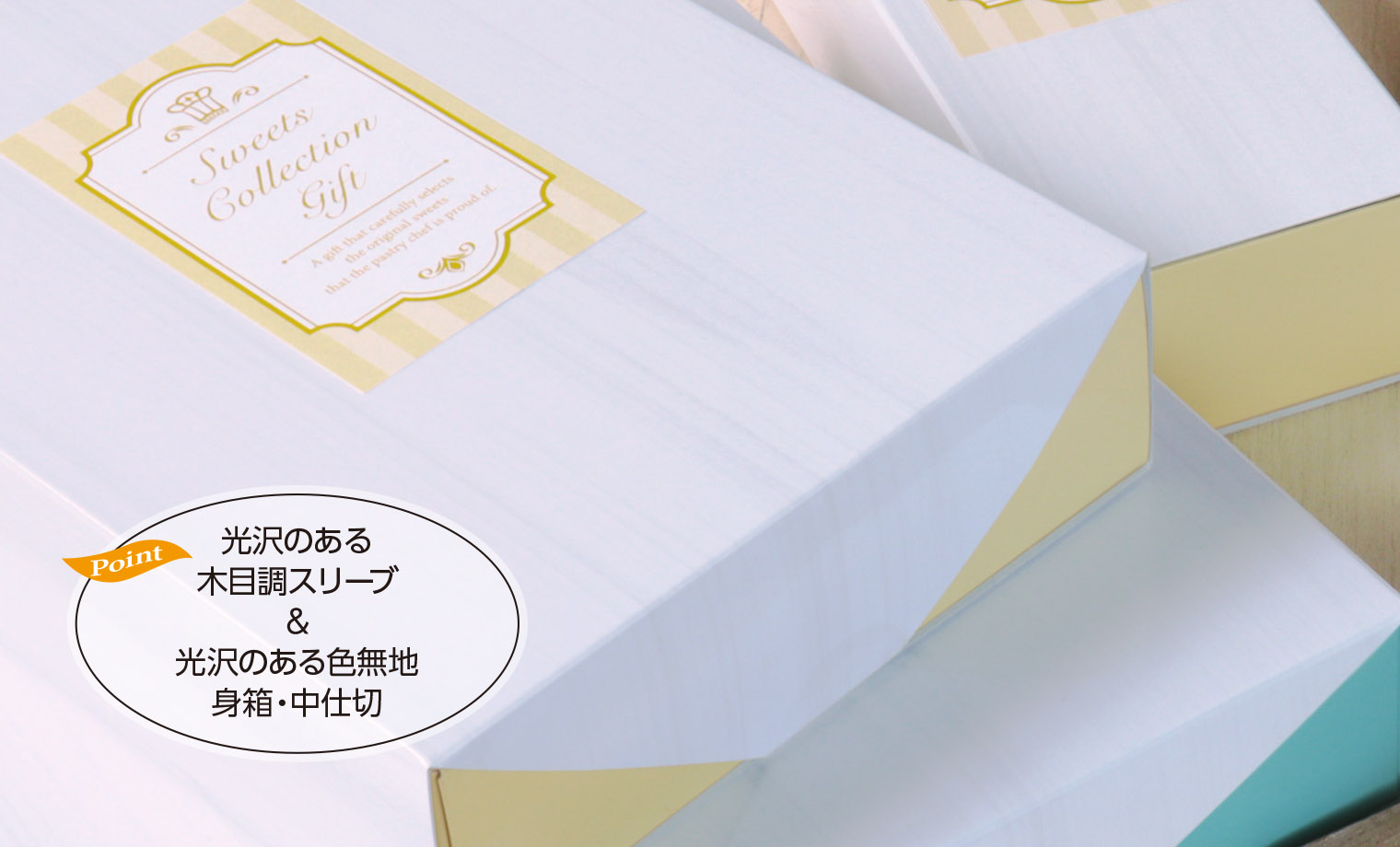 スリーブ形態で、スリーブ(蓋)と身箱(中仕切付き)は別売りとなっており、身箱の色がクリームとミントからお選びいただけます。また、100枚〜オリジナルが作成できる「選べるシール」や「箔押加工」などセミオーダー(後加工)システムを使って、オリジナルパッケージにカスタマイズも可能です。