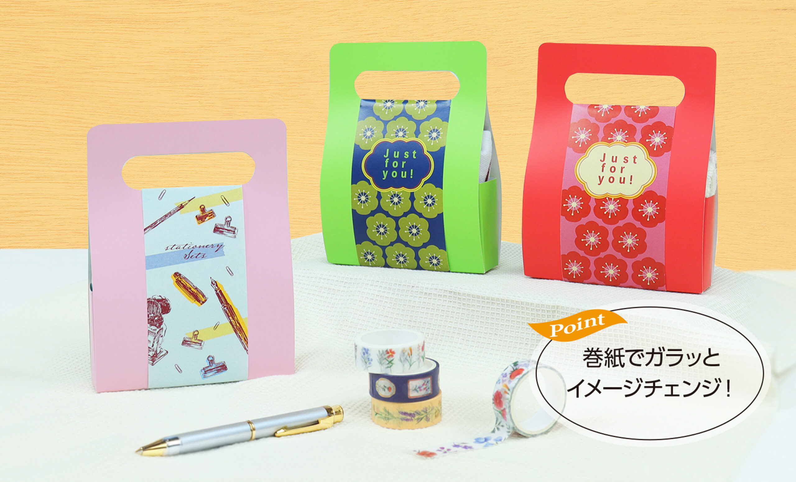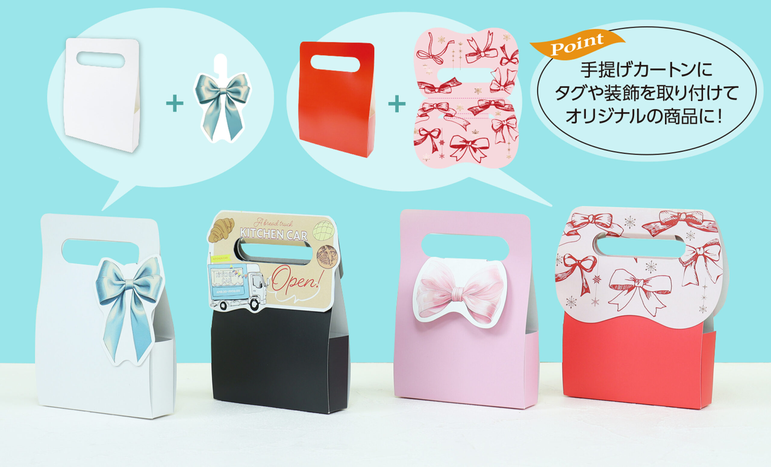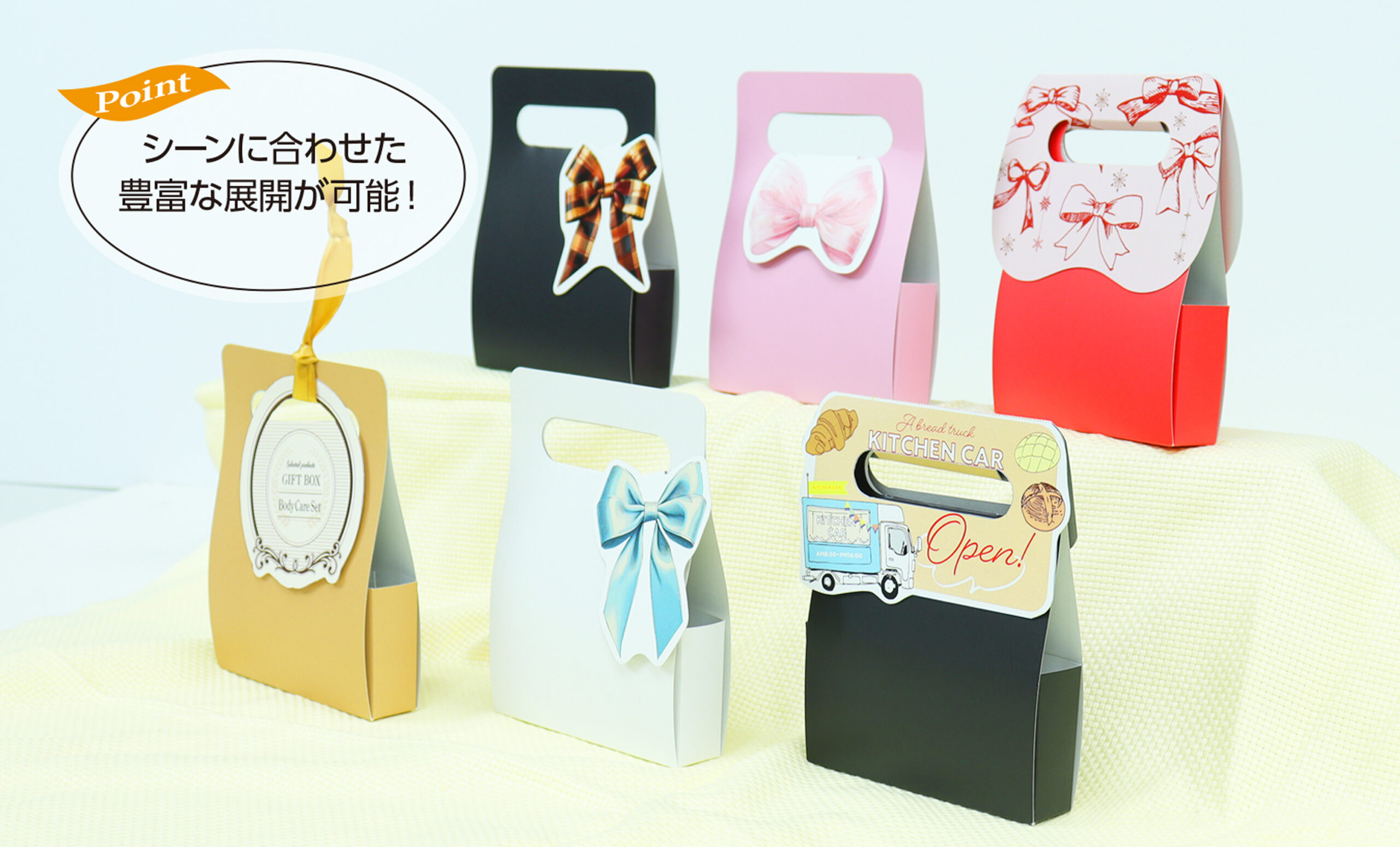 シンプルな無地カートンだからタグや巻き紙、箔押し加工で多様なパッケージが展開できます!