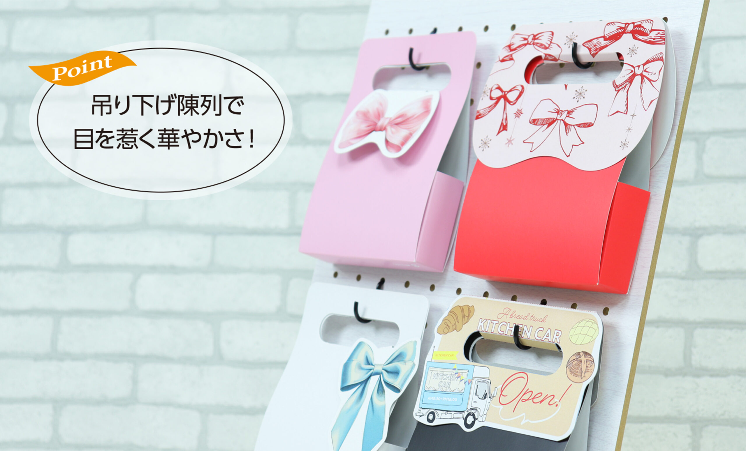 自立できる紙器カートンなのですぐに店頭に陳列できるのが魅力。取手付きなので吊り下げても◎