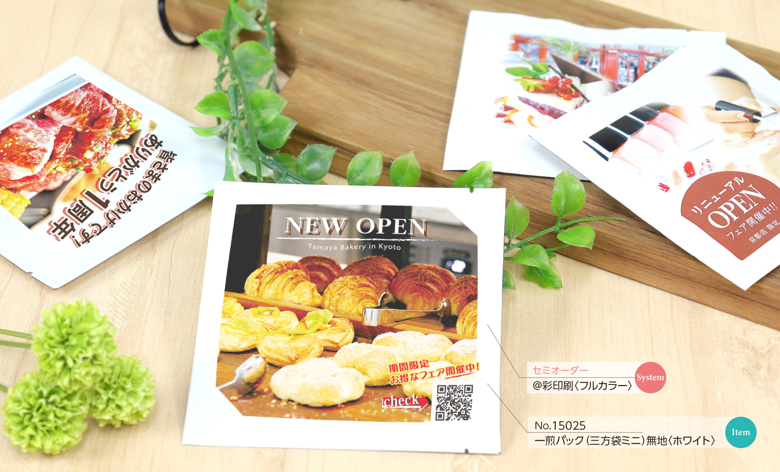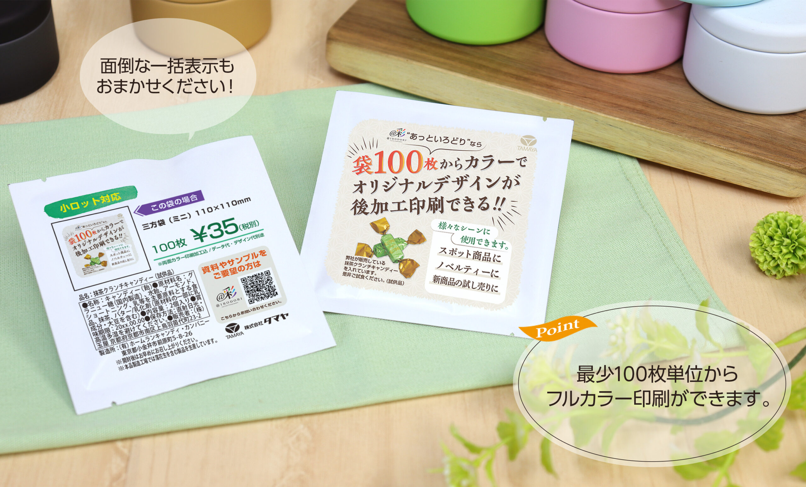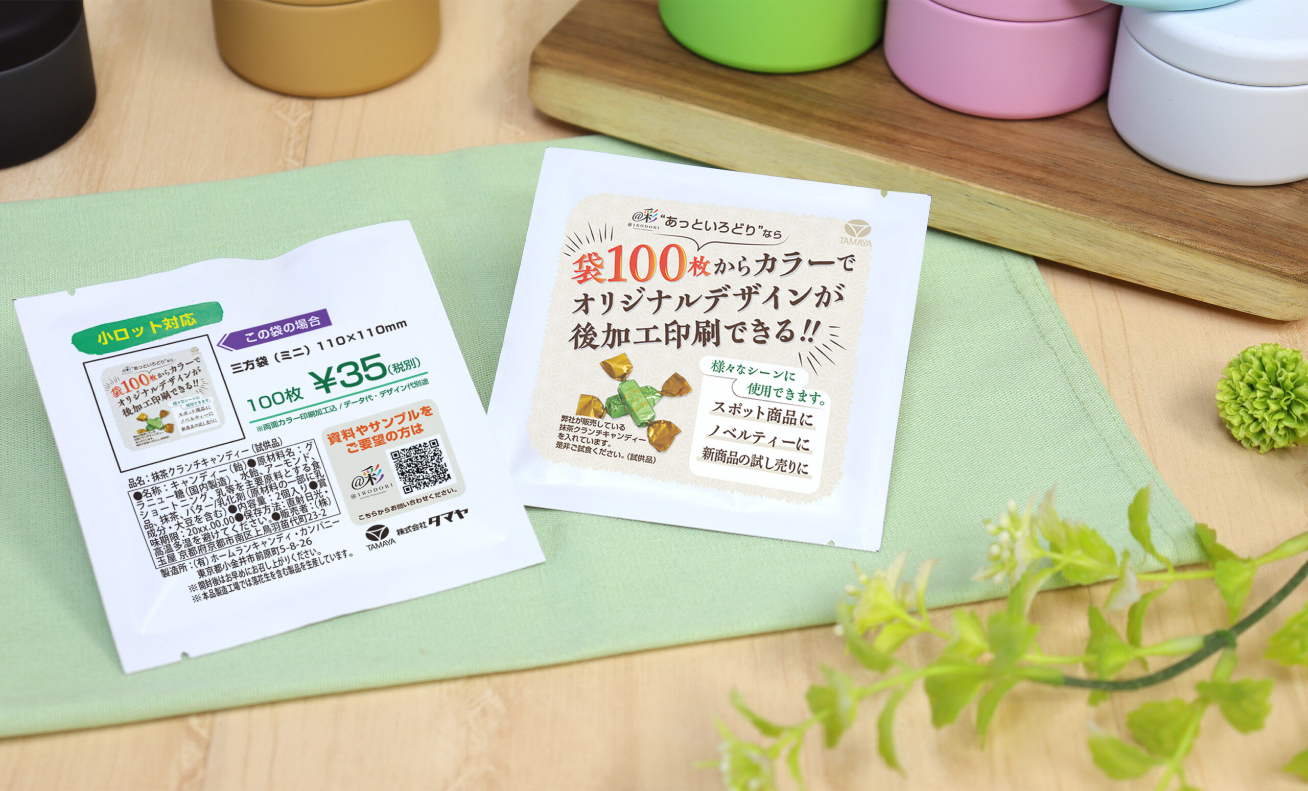 最少100枚から可能!表裏にフルカラー印刷できる一煎パック(三方袋ミニ)!