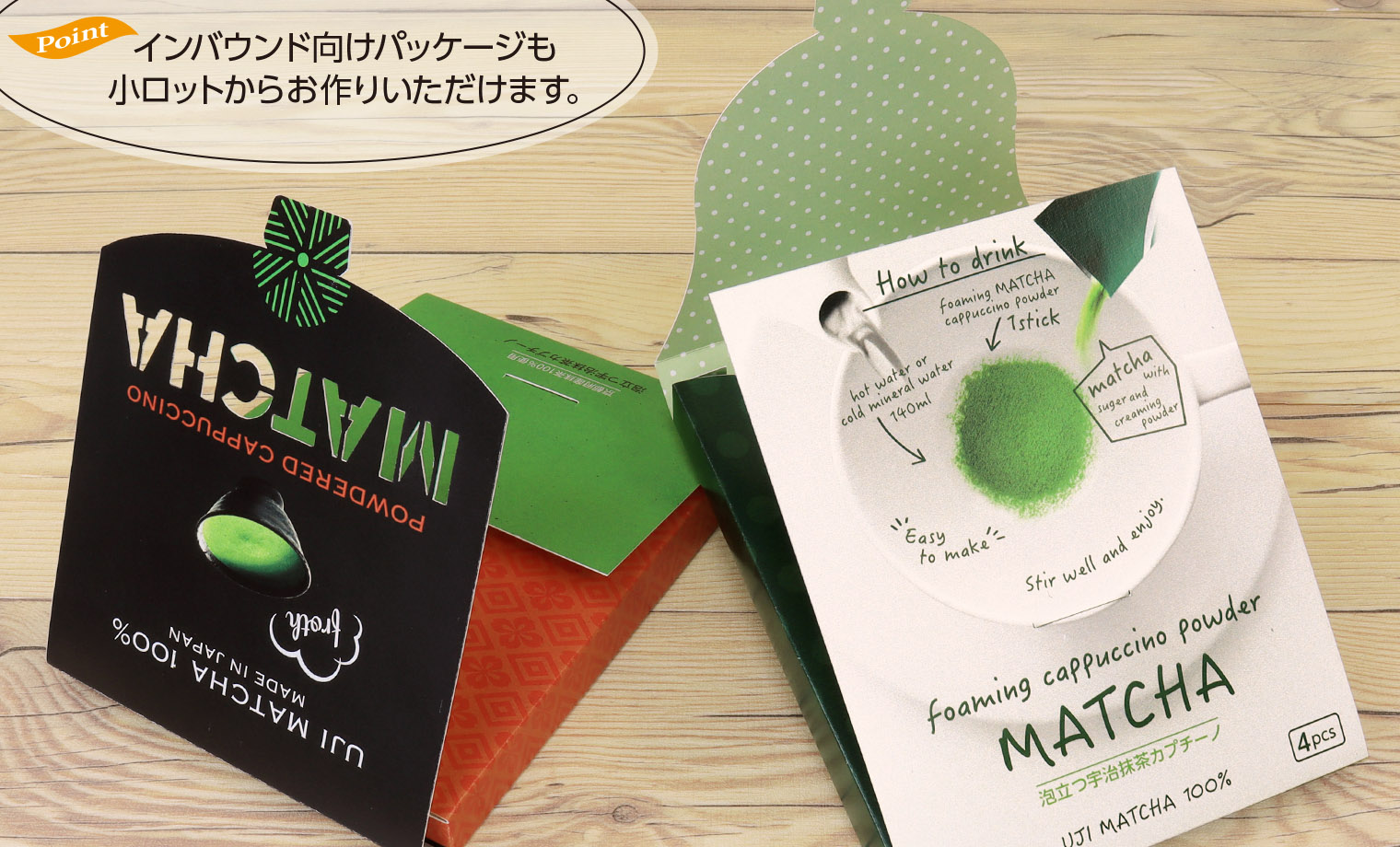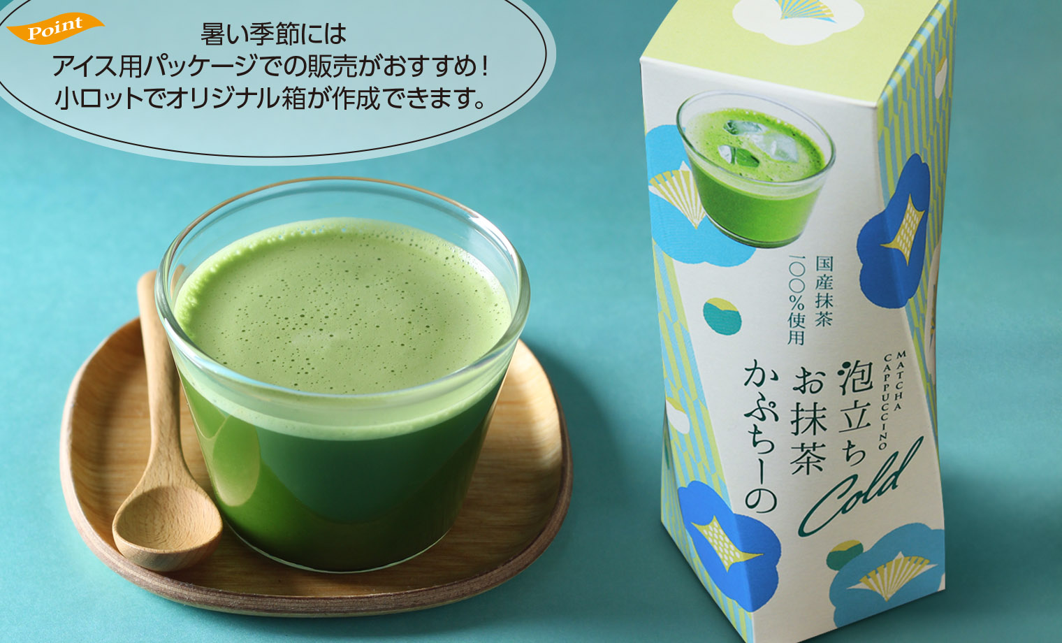 デジタル印刷でオリジナルパッケージを作って抹茶スティックをセットすれば、オリジナルのパッケージで「抹茶カプチーノ」を販売することが可能です。